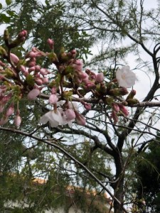 通りかがった家の庭から、桜木がのぞいており、先端に花が白く咲いていたのでございます。