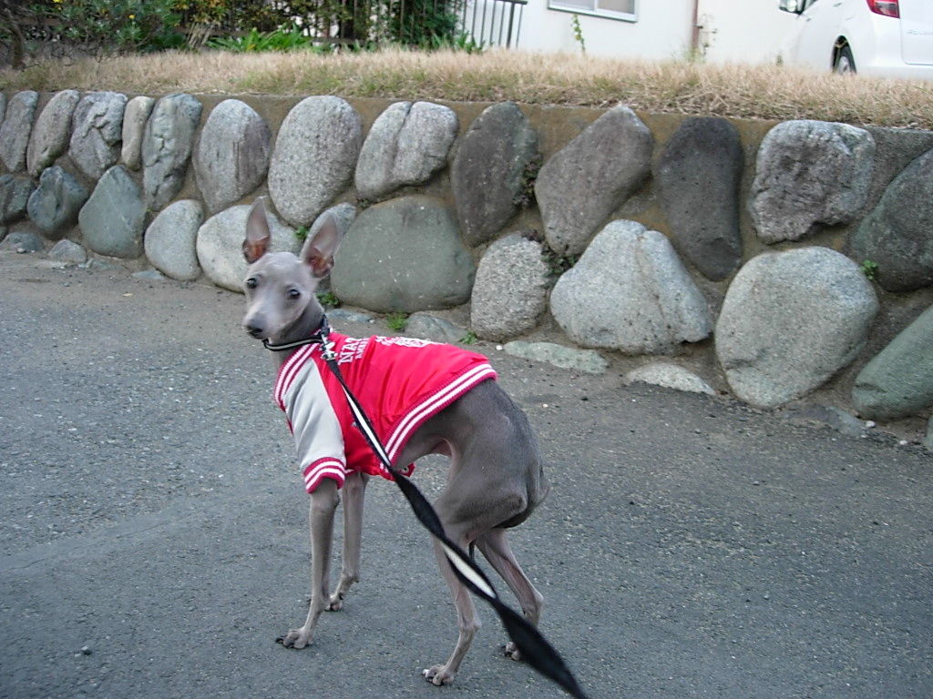 ご覧のようなカッコ良いジャンパーを着せて散歩に連れ出したら、とても迷惑そうな表情をするのであります。