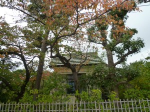 とある年代物の屋敷は枯れ葉がはらり。夏の間は木の葉で隠されていた屋敷がのぞいております。