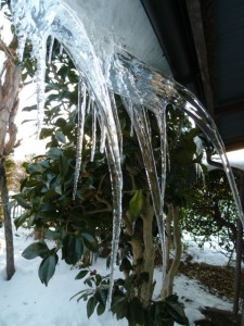 車庫の屋根の雪が昼の日差しでずり下がりましたが、午後の冷え込みでつららが巨根となって地面に届きそうなほどであります。
