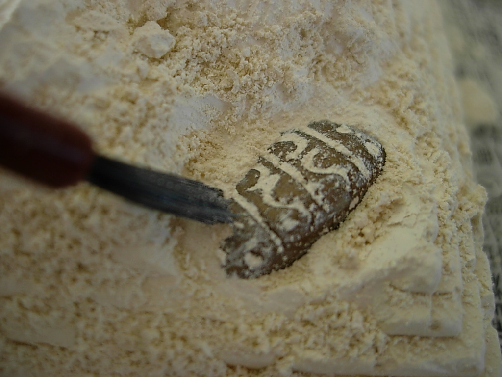 かれこれ15分も掘り続けた頃、奇妙なモノが出現。丁寧に発掘刷毛で石膏のカスをどかしましたら、不思議な文様が現れたではございませぬか。
