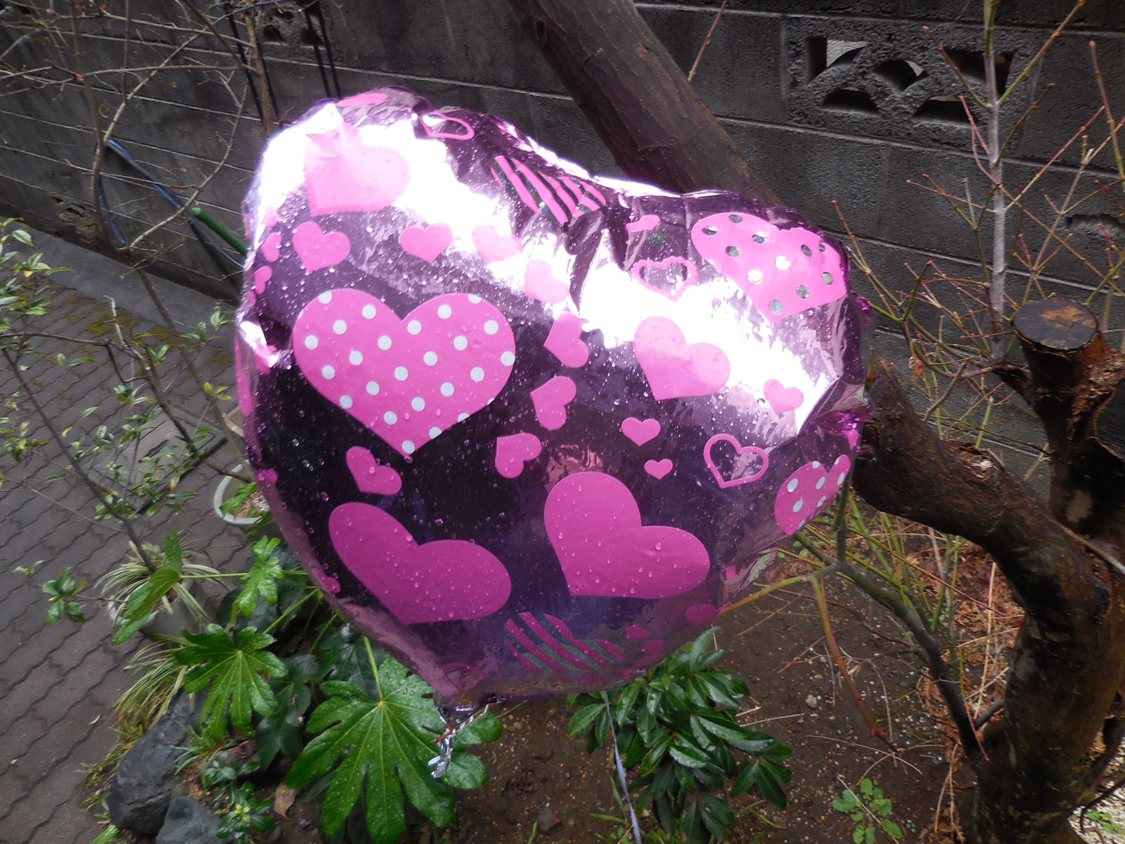 「だからちゃんと!」と叱られたのか、「まあいいさ」と慰められたのか、それは分かりませんが、この一家から何かが離れたのは確かでありましょう。そして風船は力尽きて我が庭先の木の枝に着地したわけでございます。