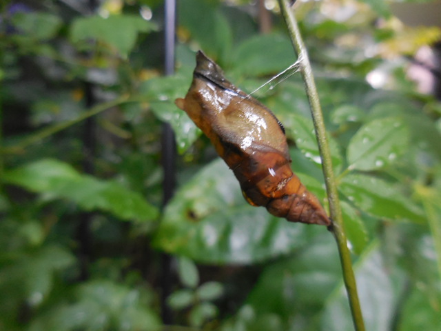 庭先に、たぶん蛾でありましょうが、さなぎを作って雨にうたれておりました。