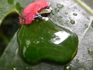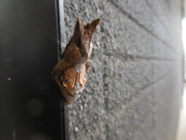 庭の葉の水滴を映したカメラをしまおうとしたら、玄関先に蝶のさなぎをみつけました。