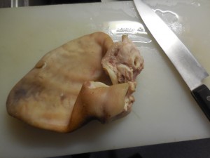 とにかく豚の耳を千切りにしまして、それから圧力釜へ。
