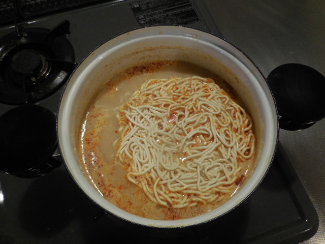 鍋に水を張り沸騰させ、Aの袋からは真っ赤なタレ。エビの出汁と辛そうな匂いのヤツを絞り出すのであります。