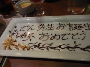奇妙なご招待がございまして、不安ゆえ、水杜先生に同伴を願って、赴いたところ、「でん先生」というチョコのプレートがございまして、