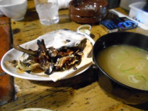 骨まで焼いて食いまして、味噌汁を納めに「お勘定を」でございます。