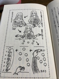 七つの円蓍を両手の掌に包むようにして攪拌し、テーブルに落とすのであります。