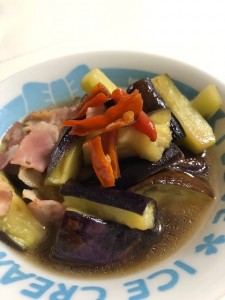 数本を、事務所に持ち帰りまして、ほんの半本を使い、茄子炒め。