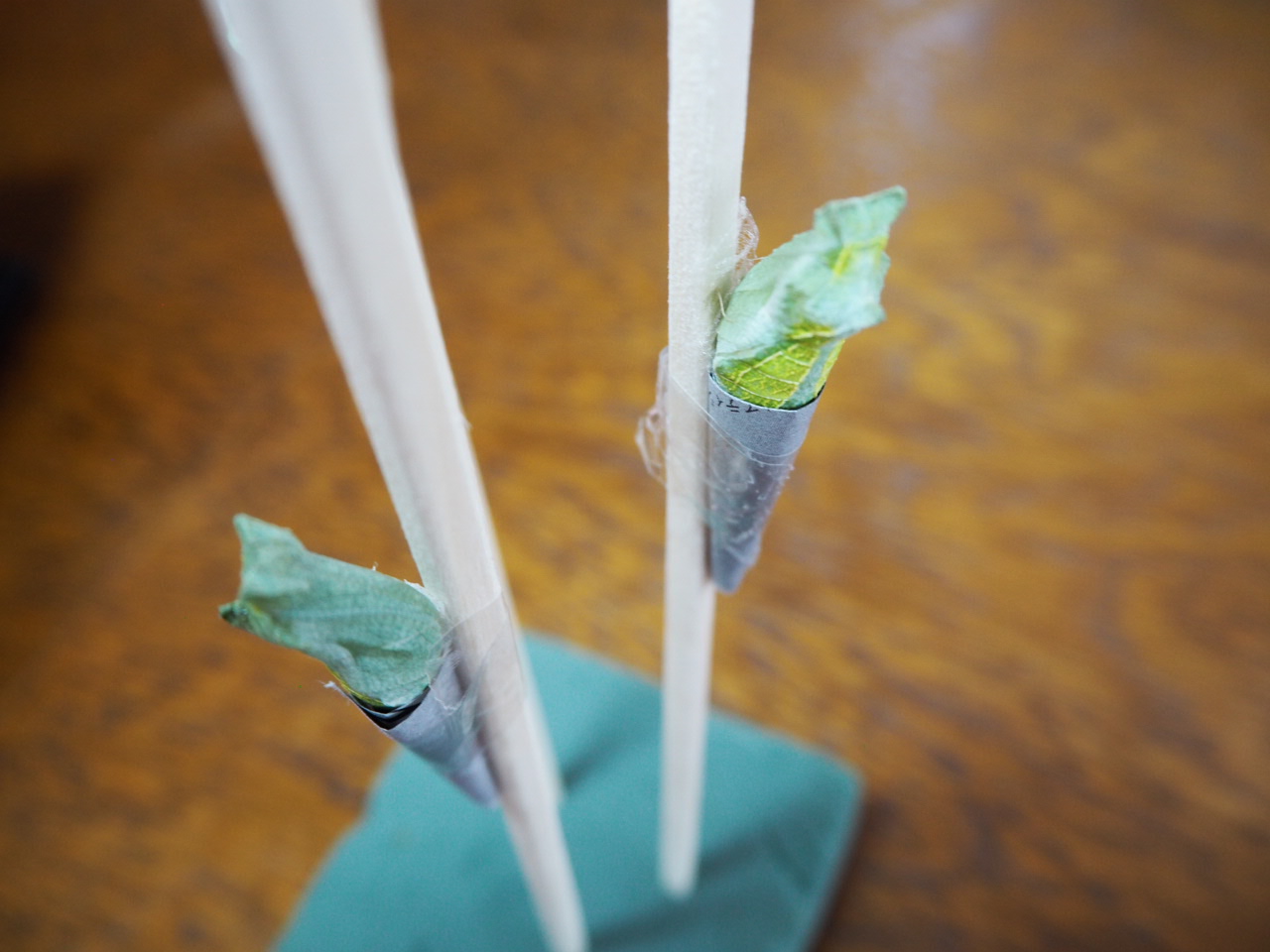 アゲハのサナギが鳥に食われそーになっておりましたので、柚子の枝から取り外し、画像のように割りばしに移しましたです。