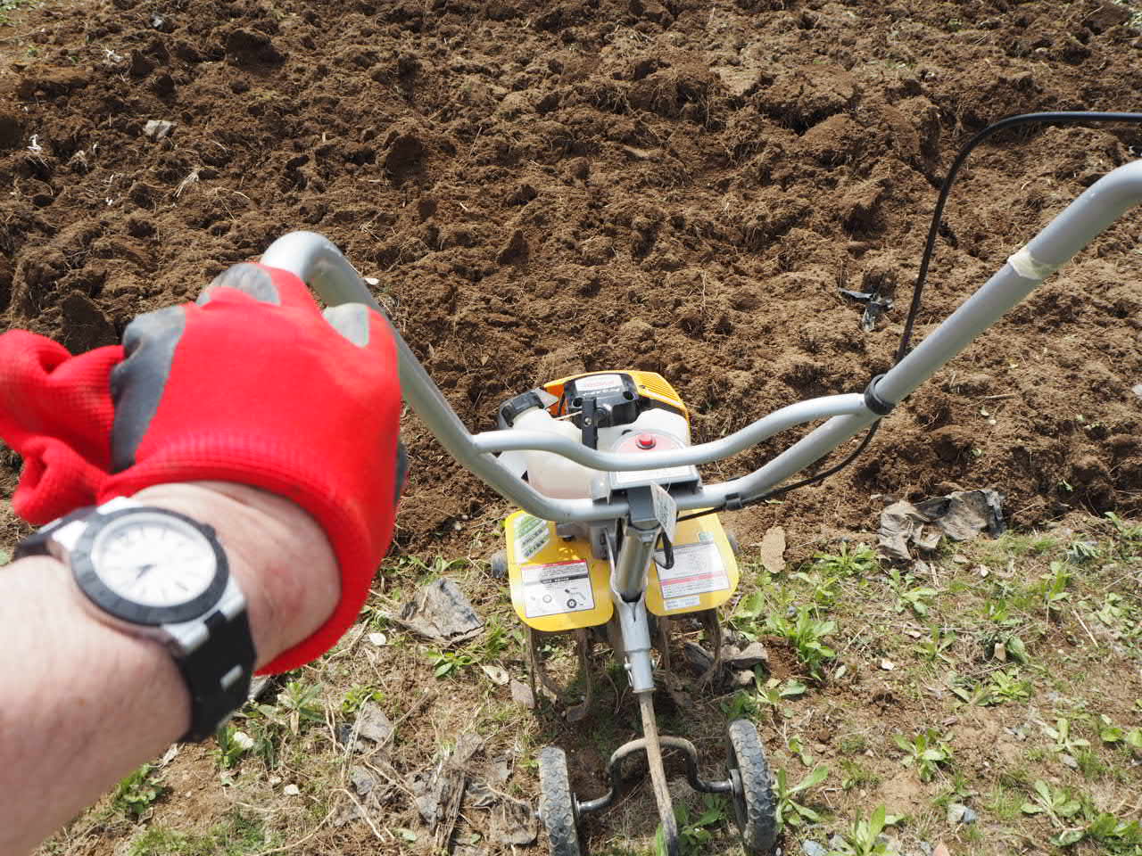 モーターというのか、エンジンというのか、とにかく耕運機が勝手に進み、へっぴり腰でハンドルを握っているのが精いっぱい。