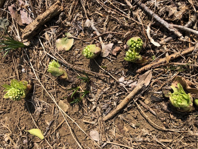 モリオカの実家の鉄門をひらきましたら、空き地に春の日差しが降り注ぐ一面に、バッケの顔がのぞいておりました。