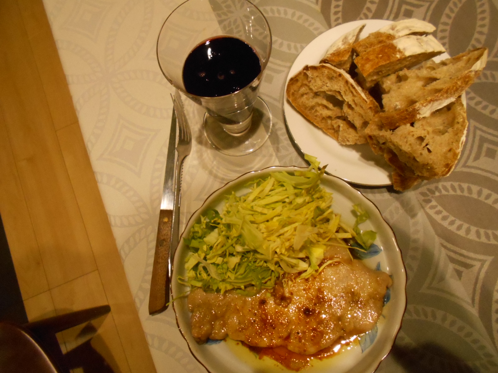 ポーク用のブタ肉に塩を振りかけ、小麦粉をまぶしまして、軽く焼き、それから梅酒をじゃぶじゃぶかけて仕上げの焼きに入るのであります。