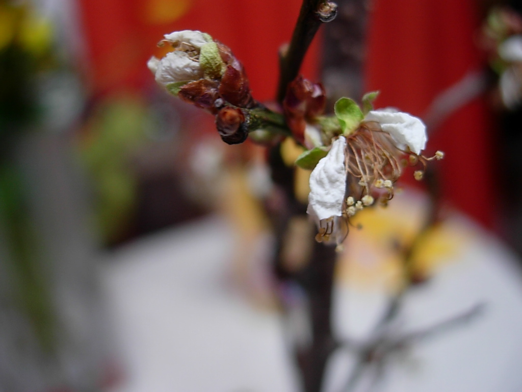 昨年末といいましても、つい一か月前のことでありますが、近所の梅の枝を手折りまして、水差しに入れておりましたら、キレイなお花をつけました。