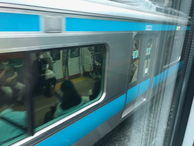 となりを走る電車をのぞき込み、