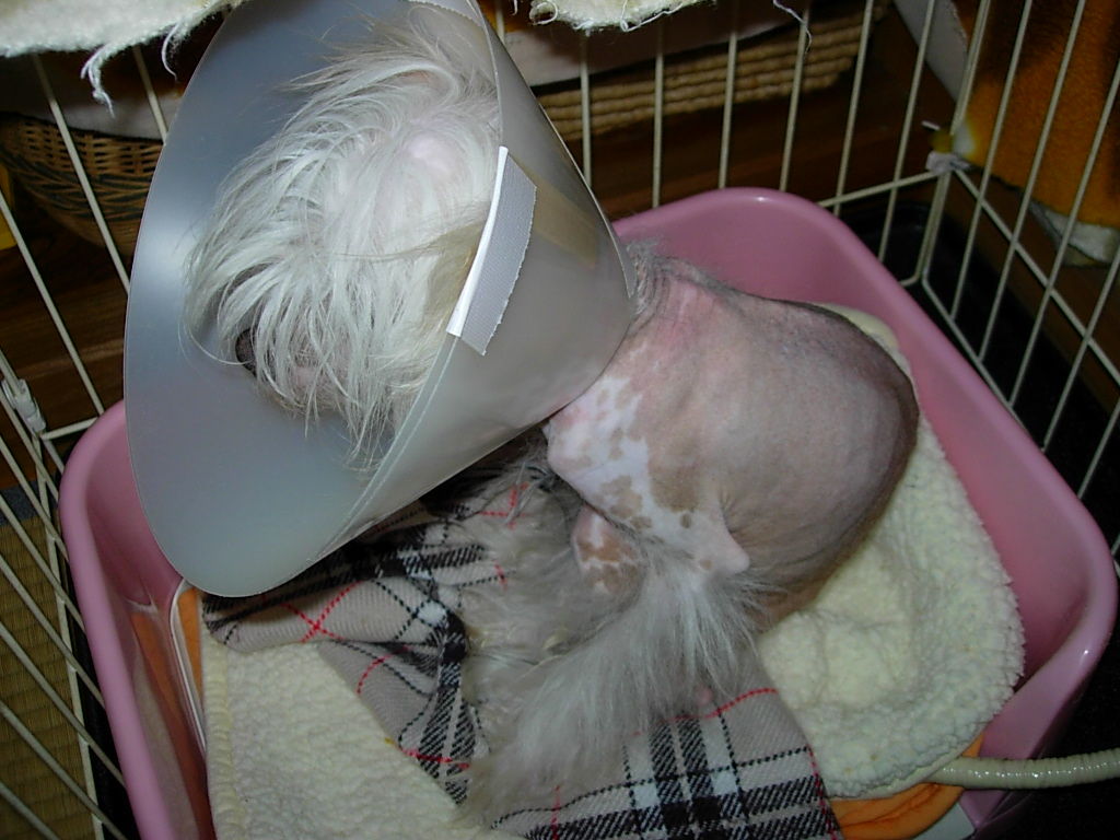 エリザベスカラーのために服を着せることもかなわず、ヒーターをきかせたシートの上で、このような情けない姿。